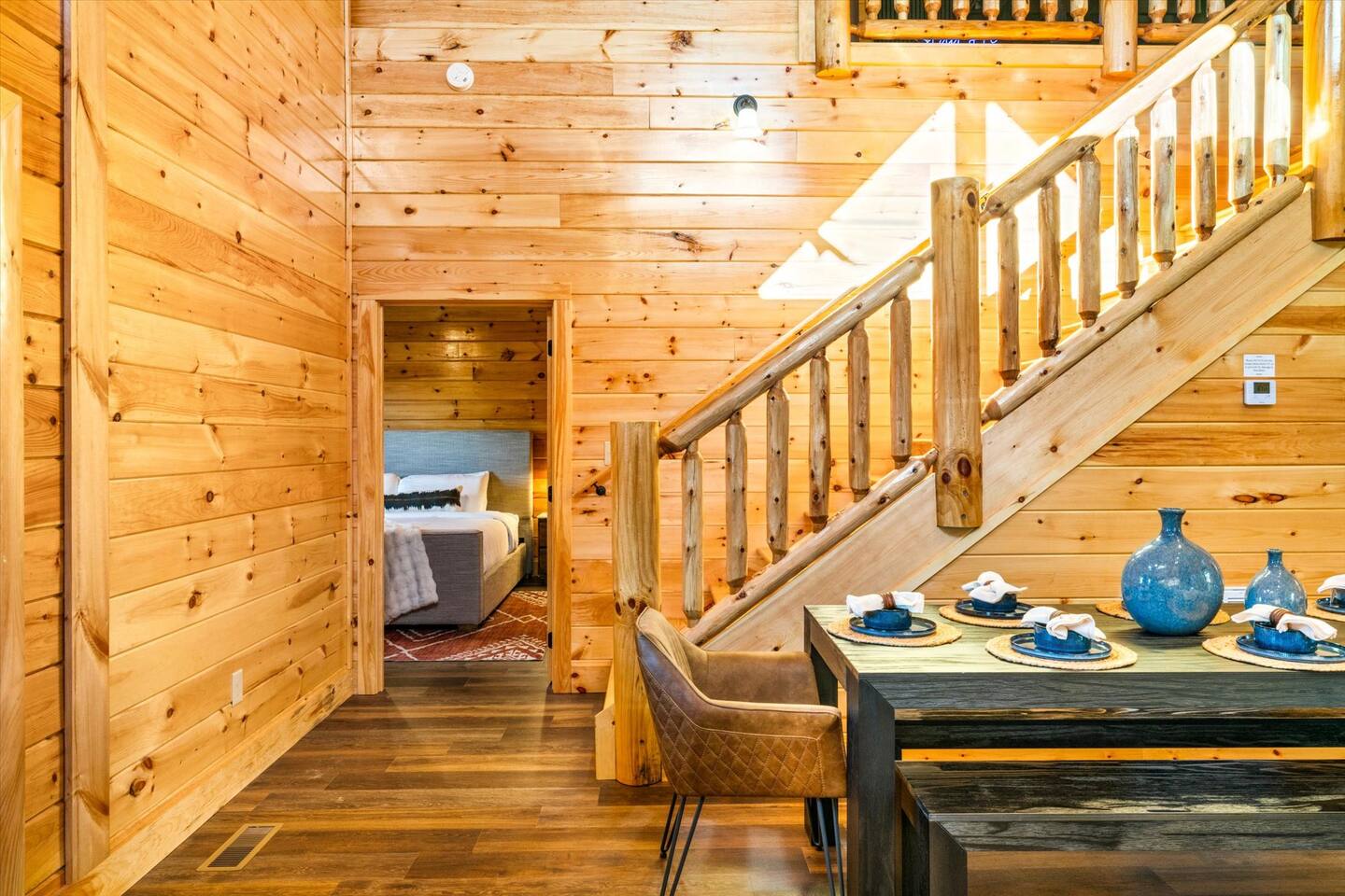 Welcome to Mountain Luxe Paradise — a brand-new cabin built in 2024 with modern amenities and plenty of space to relax and play. At nearly 2,400 square feet, this four-bedroom, four-bath retreat is designed for families, kids, and even pets. Each bedroom has its own TV and private bathroom, with two bedrooms on the main floor and two upstairs. Three bathrooms feature walk-in showers, while one main-level suite includes a bathtub. A Graco Pack ’n Play is also provided for little ones. The fully loaded kitchen includes a coffee maker, Instant Pot, toaster, cookware, and all the essentials for dining in. Outside, enjoy a propane grill with tools, dining chairs on the patio, and a bubbling hot tub under the stars. Entertainment is endless with video games, Smart TVs throughout, and a private indoor pool located just off the living room, secured with a keypad lock for children’s safety. Bathroom towels, kitchen towels, and starter supplies are thoughtfully included to make your stay stress-free. Best of all, this cabin sits in the heart of downtown Pigeon Forge — giving you the perfect balance of a peaceful retreat and unbeatable access to attractions, dining, and entertainment.